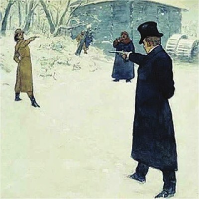 1837年2月8日,俄歷1月27日,彼得堡郊外寒風(fēng)刺骨,冰雪覆蓋著黑河。下午5點(diǎn),肅殺清冷的雪地上,出現(xiàn)了兩個手握左輪槍的決斗者———詩人普希金和皇家禁衛(wèi)軍龍騎兵中尉丹特士。天空陰沉,氣氛肅殺,助手將上了子彈的手槍交到兩人的手中。按照決斗的規(guī)則,相背的雙方在開始信號發(fā)出后,同時轉(zhuǎn)身向界線處跑去,先到者先開槍。丹特士眼見普希金比他快捷一步,情急中居然不顧規(guī)則搶先開了槍……子彈打中了普希金右腹,倒下的普希金努力撐起身子,瞄準(zhǔn)丹特士,扣動扳機(jī)。丹特士應(yīng)聲倒下,聲稱打中了胸部。事實(shí)上,他在普希金開槍時已經(jīng)側(cè)身用手護(hù)胸,子彈只是擦著他的手。兩天后,重傷的普希金撒手人寰。