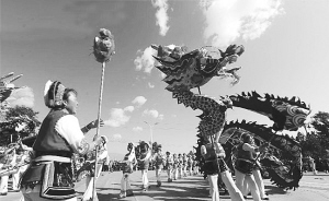 舞龍的隊伍過來了。一條大黃龍扭動著碩長的身軀,張牙舞爪地欲吞下近在咫尺的寶珠,而龍嘴與寶珠始終就差那么一點(diǎn)點(diǎn)距離。龍焦躁不安,舞動起伏的弧度更大了……