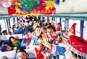 新疆56個(gè)民族代表同乘“民族團(tuán)結(jié)一家親號(hào)”列車,車廂似歡樂的海洋。吳卓勝 攝