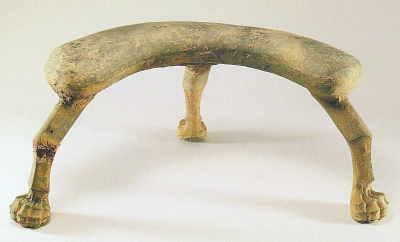 東晉南朝,曲憑幾流行一時(shí),但考古所見主要是作為隨葬明器的陶憑幾。南京象山瑯琊王氏家族墓中,一件陶質(zhì)曲憑幾(下圖)安放在棺床前的陶榻上,雖然幾筵空置,卻令人聯(lián)想到幾乎是同時(shí)期遠(yuǎn)在甘肅酒泉的墓葬壁畫中,墓主人褒衣博帶、憑幾閑坐的圖景。