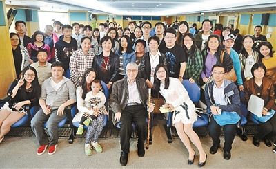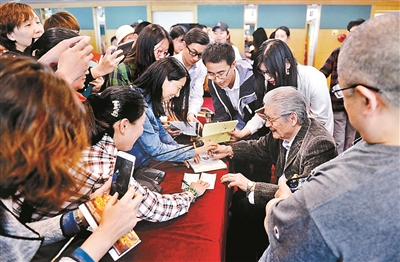 作為青睞講座與北京人藝合作的“北京人藝建院65周年”系列講座第三期活動(dòng),藍(lán)天野先生將做客北京青年報(bào)第35期青睞講座的消息剛一發(fā)出,一晚上即報(bào)名人數(shù)突破百人,“老神仙”的影響力可見(jiàn)一斑。4月23日,藍(lán)天野先生如約而至,90歲高齡卻依舊風(fēng)度翩翩,拐棍在他手里像是文明棍,似乎只是為了增添他的風(fēng)度。老先生兩個(gè)小時(shí)的講座完全脫稿,大家聽(tīng)得屏氣凝神津津有味,他卻為沒(méi)有稿子感到有些抱歉,他說(shuō)以往自己的講座都會(huì)寫(xiě)稿,可是這次因?yàn)樗淮_定是什么樣的讀者來(lái)聽(tīng),不知道大家愛(ài)聽(tīng)哪方面的,就沒(méi)有準(zhǔn)備文字內(nèi)容。而事實(shí)上,藍(lán)天野先生講座時(shí)思路清晰,語(yǔ)言嚴(yán)謹(jǐn),令人嘆服,而其多年練就的聲音功力,更是使得其每個(gè)音節(jié)都發(fā)音清楚,不用麥克風(fēng),也可傳遞到最后一排觀眾的耳中。
