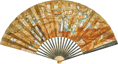 來(lái)自意大利波旁家族雙西西里的公主嫁入法國(guó)皇室,成為貝利公爵夫人,她為參加?xùn)|方主題舞會(huì)特地定制了這把折扇。扇上畫的是中國(guó)古戰(zhàn)場(chǎng)一將誘敵深入的故事。此扇不僅扇骨用金漆工藝,扇面也漆工藝粘嵌貝母,模仿中國(guó)螺鈿工藝。此扇尺寸碩大,工藝夸張,特為交際場(chǎng)合的風(fēng)情炫耀而制作。相比之下,道光帝御題的折扇才真正是隨身?yè)]舞納涼的日常之物,扇上詩(shī)畫呈現(xiàn)出道光皇帝的閑吟逸趣。