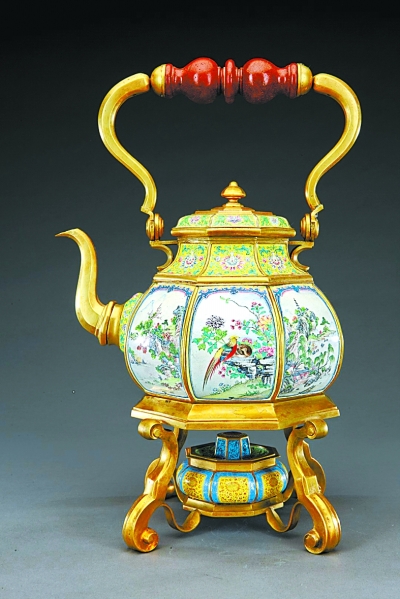 乾隆款畫琺瑯八棱開(kāi)光提梁壺是故宮博物院珍藏的最重要的畫琺瑯器物之一,其帶加熱爐和支架的提梁壺結(jié)構(gòu)來(lái)自西洋器物的啟發(fā)。造型洗練大方,有西洋幾何風(fēng)格。S形支架盡端的渦卷式,提梁上金星玻璃做成的提手亦仿西洋花柱形式。八面開(kāi)光內(nèi)以西洋琺瑯彩表現(xiàn)中國(guó)傳統(tǒng)山水花鳥(niǎo)畫,而卷草紋樣細(xì)節(jié)又帶有西洋風(fēng)格。