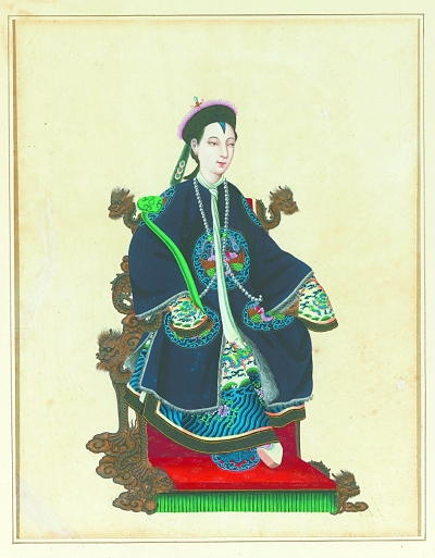 法國(guó)人不能確定這幅人物畫像的身份,甚至有人名之曰“中國(guó)皇后像”,從畫中各種服飾特征看,這根本不是皇后的裝束。實(shí)際上,在1901年以前,西方商人和使節(jié)也見(jiàn)不到中國(guó)皇宮中的后妃。畫像中很多細(xì)節(jié)特征并非完全捕風(fēng)捉影,但當(dāng)這些特征組合于一身時(shí)就顯得荒誕走形了。應(yīng)該說(shuō)這是一幅想象中的中國(guó)貴婦人畫像,并非寫實(shí)。清代后妃和官員夫人們身著朝服袍褂時(shí)會(huì)佩戴三掛朝珠,畫像中只畫了左右兩肩斜戴的兩掛,缺了正中套在脖頸上的最重要的一掛。