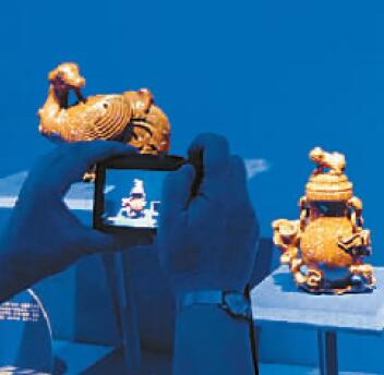 5月8日,“紫禁城與‘海上絲綢之路’”展開幕式上,觀眾正在拍攝金星玻璃燒造的系列工藝品。本報記者 王國平攝 光明圖片