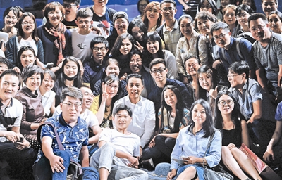 更讓人暖心的是,為了讓每個觀眾都可看到他,馮遠征兩個多小時的講座始終站著。為他準備的桌子、椅子和茶杯成了安靜的道具,且細心地考慮到三面座位的觀眾,馮遠征會不時轉(zhuǎn)向各個方向,讓身處劇場角落的觀眾也似乎感覺馮遠征一直在看著他講。結(jié)束時,馮遠征更是恭敬地沖三面觀眾鞠躬致謝。而在已經(jīng)進入人藝會議室準備回家時,聽說劇場里的讀者想與他合影,馮遠征立刻跑出來,并且一下子坐到地上,邀請大家,“來吧!”于是講座時有些拘謹?shù)淖x者,立刻瘋狂起來,沖到馮遠征身邊,與這位表演大家幸福留影。