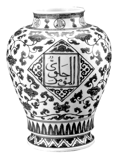 明永樂時期海外貿(mào)易興盛,與西亞地區(qū)的交流日漸增多,因而出現(xiàn)了一些帶有異域風情的瓷器。這件瓷瓶仿西亞阿拉伯地區(qū)金屬器造型及紋樣,腹部輪花紋是阿拉伯地區(qū)特有的紋飾。明正德年間,還出現(xiàn)了以阿拉伯文作為瓷器的裝飾紋樣。