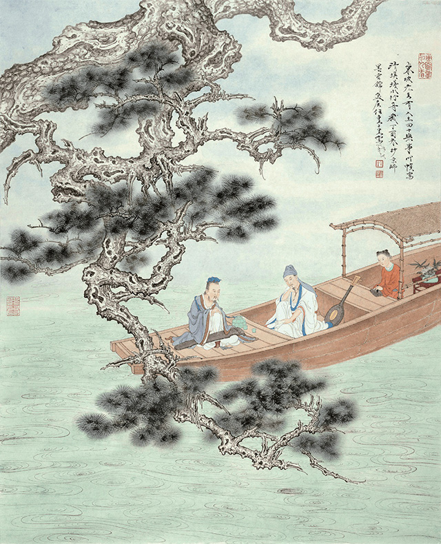 《清溪淺水行舟》的構圖遵從傳統(tǒng)中國畫亦開亦合的布局,畫中一樹偃松垂下,兩名高士攜一名童子乘扁舟而行。作品細節(jié)生動逼真、一絲不茍,彰顯了藝術家的高超技法和虛實結合的繪畫理念,不僅展現(xiàn)了古人的精神狀態(tài),也表達了作者對當今現(xiàn)代人生活狀態(tài)的哲思。主辦方表示,此次“一幅畫的展覽”是其推廣中國藝術家及其作品的新形式。畫展將通過關注佳作的創(chuàng)作者、繪畫技法、原材料、印章及這些元素背后的故事,從不同視角展現(xiàn)藝術家的風采。