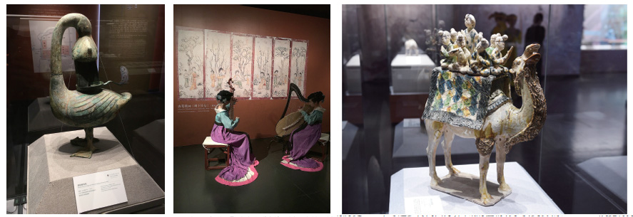 左起:1、彩繪雁魚燈(西漢)2、唐墓壁畫《樹下仕女》3、三彩駱駝載樂俑(唐)