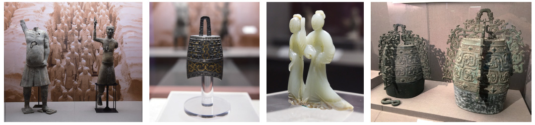 左起:1、百戲俑(秦)2、錯金銀樂府鐘(秦)3、玉舞人(漢)4、秦公镈(春秋)
