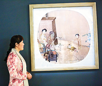 中國刺繡有著比紙上繪畫更悠久的傳統(tǒng),參展藝術(shù)家、國家級(jí)“非遺”傳承人姚慧芬用上百種不同的針法來再創(chuàng)作李嵩《骷髏幻戲圖》、馬遠(yuǎn)《十二水圖》這兩幅宋代古畫。當(dāng)皮影、刺繡和實(shí)時(shí)錄像、動(dòng)畫、自動(dòng)機(jī)械表的表演配合展示時(shí),給人一種時(shí)空交錯(cuò)的感覺。