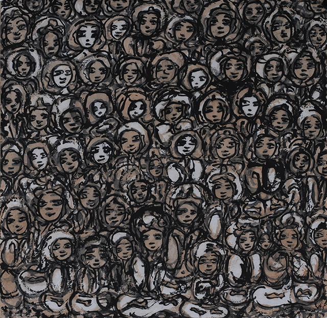 朱振庚早期的水墨作品是從畫壇主流的現(xiàn)實(shí)主義的水墨體系中承襲而來,但在他研究生畢業(yè)之后,受現(xiàn)代思潮的影響,他的水墨語言開始走向現(xiàn)代重彩的構(gòu)建。從重彩到水墨是中國繪畫史上的發(fā)展歷史邏輯,而從水墨再到重彩,則是在現(xiàn)代語境下朱振庚尋求傳統(tǒng)繪畫的當(dāng)代轉(zhuǎn)型的路徑之一。朱振庚言:“中國藝術(shù)必須依托于現(xiàn)代藝術(shù)這個(gè)背景才能活躍起來,現(xiàn)代重彩切忌‘洋味’重彩,需從中國文化精神中生得主根,尊重傳統(tǒng)(但不迷信傳統(tǒng)),涉獵中外,吞吐古今,創(chuàng)造新的傳統(tǒng)。”朱振庚對(duì)于中西傳統(tǒng)有著很明確的態(tài)度和立場(chǎng),這種對(duì)傳統(tǒng)文化的自信和自知是他藝術(shù)創(chuàng)作中民族性的保證。在他的重彩畫中,不僅汲取了西方現(xiàn)代主義繪畫中的造型和構(gòu)成等諸因素,還從中國民間戲曲美術(shù)中借鑒了形象和色彩等諸手段。民間壁畫的肌理感承載著歲月流沙的痕跡,也被他轉(zhuǎn)化為重彩語言的符號(hào),成為畫面形式感的修辭。朱振庚在構(gòu)建現(xiàn)代重彩的視覺體系之中,充分調(diào)動(dòng)了“色”“墨”“粉”三種元素,參照古代壁畫的手法,他以墨筆隨形生發(fā),以色寫染,再以粉色筆,三種元素各自為用,在銀灰色調(diào)的肌理趣味之中,交錯(cuò)碰撞,又渾然一體,下筆意氣所到,生機(jī)勃勃,韻味于厚重疊加中產(chǎn)生。朱振庚深刻的認(rèn)識(shí)到中國藝術(shù)中的“寫意”精神,并將之轉(zhuǎn)化在重彩圖式之中,他注重筆法,講究筆力與筆趣,認(rèn)識(shí)到在重彩畫中筆力與賦色之間的辯證關(guān)系,以筆力為骨,強(qiáng)其骨氣,色彩方能神化,若筆力有虧,畫面色彩則浮于表面,空善賦彩,徒生火氣。筆趣則是筆精墨妙之中顯現(xiàn)的趣味,而趣味的產(chǎn)生則是畫家學(xué)養(yǎng)、情緒與才情的統(tǒng)一,他追求“無羈無絆之美”,任筆觸自由表現(xiàn),靈動(dòng)之中不失法度。