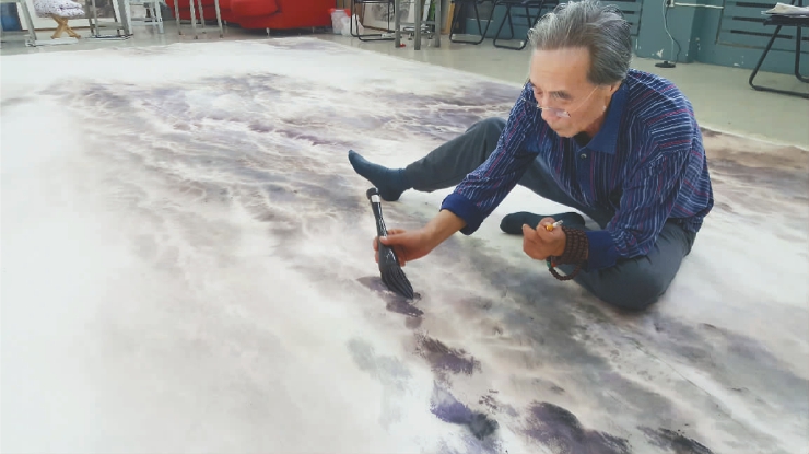 2016年9月,由宋雨桂領(lǐng)銜主創(chuàng)的《中華文明歷史題材美術(shù)創(chuàng)作工程》入選作品《黃河雄姿》的創(chuàng)作進(jìn)入最后階段。宋雨桂先生帶著助手遍尋當(dāng)今各類表現(xiàn)黃河題材的繪畫形式,技法參考,嘗試多種表現(xiàn)水的手法,矢志畫出黃河新意。他們數(shù)度推敲反復(fù),五易其稿,最終定稿以中近景特寫表現(xiàn)天上來之黃河“水” ,以凸顯黃河奔騰激越之氣勢。此時(shí)工程作品已陸續(xù)集稿,一絲不茍的宋雨桂先生,抱病親自操刀動筆創(chuàng)作,從發(fā)來的電子圖片中看到宋雨桂先生全身趴著、跪著濡墨揮寫的情景,令人動容。巨大尺幅的作品在先生的連續(xù)奮戰(zhàn)下如期完成、裝裱,運(yùn)抵中國國家博物館,并在全國第十次文代會期間向首都公眾展出。作品以恣意縱橫、舒卷揮灑的寫意筆調(diào)將黃河奔瀉而下、浪花跳躍表現(xiàn)得出神入化,近觀通透而大氣渾成,遠(yuǎn)視厚重又具撲面的傾壓之感,令人宛若置身激流之中,其轟鳴之聲振聾發(fā)聵。作品融具意象、抽象一爐,寫實(shí)寫意兩相得宜,恰如其分的技術(shù)掌控獲得了驗(yàn)收專家的高度好評和觀眾的廣為贊譽(yù)。作品如愿入藏中國國家博物館,并將懸掛于殿堂之中。 《黃河雄姿》成為了宋雨桂藝術(shù)創(chuàng)作的巔峰之作和泣血絕筆之作,撂下畫筆的宋雨桂先生便累倒在病榻之上,自作品2016年11月20日展出至他今年5月15日去世僅半年。令我至今想起便覺得愧疚不安的是,沒有制止他的傾情投入,沒有顧及到勞累給他帶來的健康侵害。他的自信和執(zhí)拗秉性讓他全然不顧親人和學(xué)生的勸阻,這或許與他性格中的剛強(qiáng)自尊有關(guān),但我終無法為之釋然而成為心中之痛。