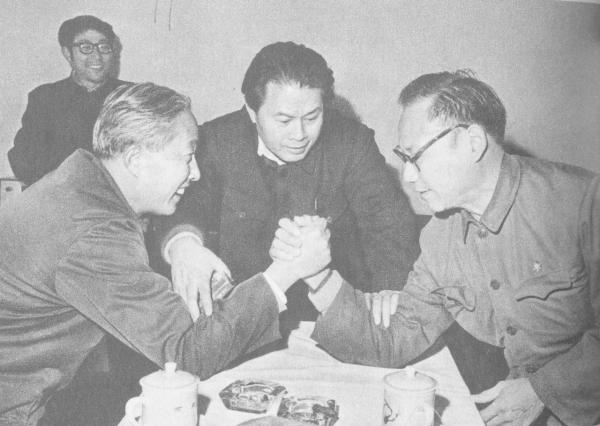 1979年文代會(huì)期間,華君武(左)與方成在做掰手腕游戲,中間是畫家亞明當(dāng)裁判