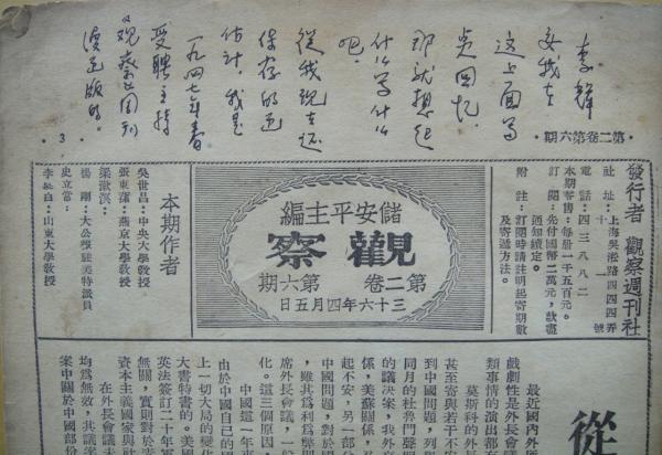 正好我收藏有一九四七年的《觀察》合訂本,拿去請(qǐng)方成為我題詞紀(jì)念。沒(méi)想到,他從第一頁(yè)的開始寫,洋洋灑灑,連續(xù)寫了好幾頁(yè),計(jì)有兩千字?;貞洠魬?,為刊物,也為儲(chǔ)安平。謹(jǐn)摘錄部分如下: