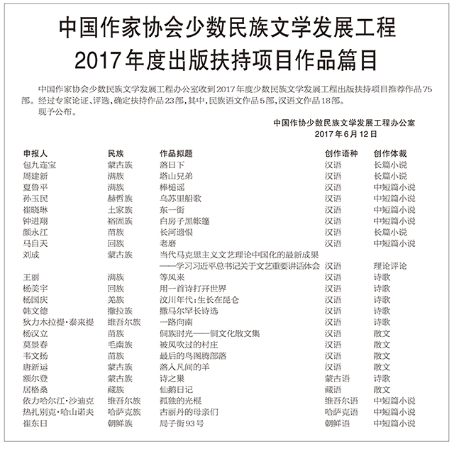 中國(guó)作家協(xié)會(huì)少數(shù)民族文學(xué)發(fā)展工程辦公室收到2017年度少數(shù)民族文學(xué)發(fā)展工程出版扶持項(xiàng)目推薦作品75部。經(jīng)過(guò)專家論證、評(píng)選,確定扶持作品23部,其中,民族語(yǔ)文作品5部,漢語(yǔ)文作品18部。