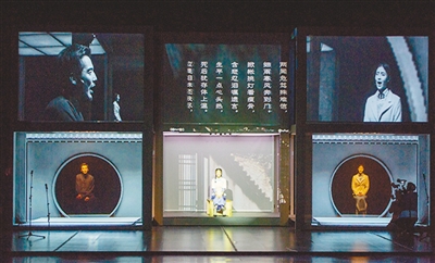 在2001年問(wèn)世16年后再度亮相,導(dǎo)演田沁鑫的《狂飆》(上圖為劇照)是做了較大的改變的。雖然她對(duì)于創(chuàng)作于2001年的文本并未進(jìn)行過(guò)多的調(diào)整,但對(duì)諸多場(chǎng)次做了重新排序,基本以主人公田漢的生命時(shí)序前進(jìn)。而更為重要的重排還是體現(xiàn)在舞臺(tái)呈現(xiàn)。隨著技術(shù)的進(jìn)步,在2001年還只能借由景片、箱體來(lái)向觀眾展示的中國(guó)話劇產(chǎn)生發(fā)展之初的圖文內(nèi)容,今年已可由“鳥槍換炮”的舞臺(tái)多媒體技術(shù)華麗呈現(xiàn);在2001年版中那空空蕩蕩的舞臺(tái),此次被裝入了一座兩層三開間且可伸縮的房型結(jié)構(gòu),其每一間前的簾幕,更作為投影的呈現(xiàn)載體。