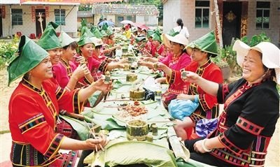 近年來(lái),在保亭黎族苗族自治縣毛感鄉(xiāng),借助每年的節(jié)慶活動(dòng)日,各村男女老少,穿著民族服裝,在一片開闊的稻田地里鋪開長(zhǎng)桌宴,招待八方來(lái)客。
