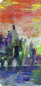 《生的回聲》作于1982年,李青萍恢復(fù)公職之后,在她眼前是一片明朗的陽光?!俺赛S色的圈形象征太陽、地球與宇宙萬物生靈的運轉(zhuǎn),椰樹象征我對南洋生活的深情眷戀和我的曲折而充滿活力的一生,人的生命如時鐘發(fā)條總會終止,吾輩已老,更應(yīng)珍惜時光。你們看那畫面上空的晚霞,正是我生命的回音,藝術(shù)的曙光?!彼诨貞涗浿羞@樣寫道。
