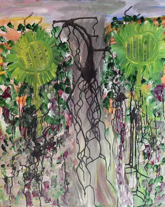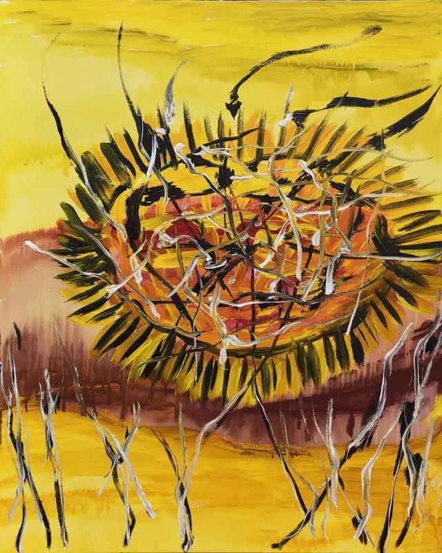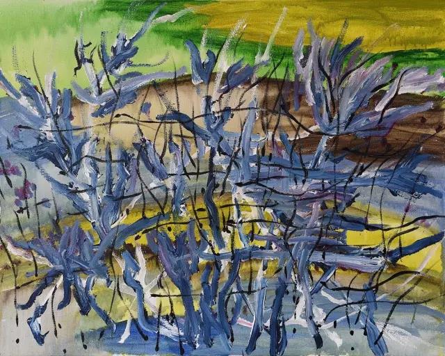 比如《繁花》,置于畫面遠(yuǎn)景的山野和置近景的河流,和置于中景的“繁花”有平分秋色之嫌,構(gòu)圖上稍顯局促。另一幅《凋零》,濃烈的色彩互相交織,凌亂的線條堆積于畫面中部,和“凋零”的主題略有背離感?!痘ㄎ戳饲椤分?,擁擠的花朵占據(jù)了畫面的全部,難免會(huì)讓視覺有太“滿”之感。