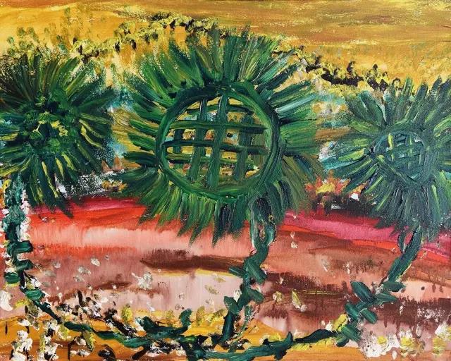 所以,海男的繪畫作品中出現(xiàn)的風(fēng)景,既彌漫著云南高原的魔幻色彩,也隱隱可見大師的風(fēng)范。她筆下的向日葵,是《白銀色的向日葵》,碩大的花朵占據(jù)了畫布的三分之二,突出和放大了觀者的視覺效果。她的另一幅布面油畫作品《水波中的葵花》,更是充滿魔幻色彩的產(chǎn)物,光影之間可以感受到印象派畫風(fēng)對(duì)她的潛在影響。她著重于描繪自然的瞬間景象,并使之成為經(jīng)典的瞬間。她將焦點(diǎn)轉(zhuǎn)移到純粹的視覺感受形式上,作品的內(nèi)容和主題變得不再重要。
