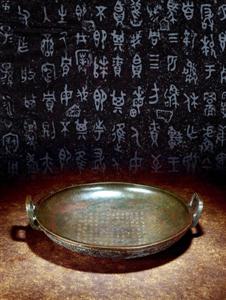 兮甲盤是漢代到宋代期間出土的商周青銅器中唯一流傳至今的瑰寶。其高11.7厘米,直徑47厘米,敞口淺腹,弧底,下原有圈足。外置雙附耳,耳與盤壁有細柱支撐。盤是盛水器,用于宴饗之前的沃盥禮。
