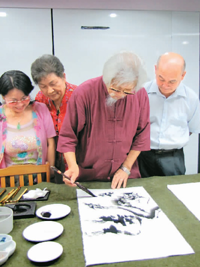 第一次與王太田先生見面,是在夏日的一個午后,在臺北“國父紀(jì)念館”西文化藝?yán)?。那天,太田先生所帶學(xué)生的結(jié)業(yè)畫展在這里揭幕,這也是34年來,太田先生在此業(yè)余教授的第三十四期生活美學(xué)國畫山水班學(xué)生的作品展覽。記者發(fā)現(xiàn),這30位“老學(xué)生”,雖然最小的已年逾花甲,最大的101歲,但是,簇?fù)碓陧毎l(fā)皆白的太田先生身邊,完全是一副“小學(xué)生”的虔敬模樣。他們一邊仔細(xì)觀摩老師示范作畫,一邊認(rèn)真聆聽老師教誨:畫山水畫時,自己心中首先要有一幅山水畫,畫作要先感動自己才能感動別人。