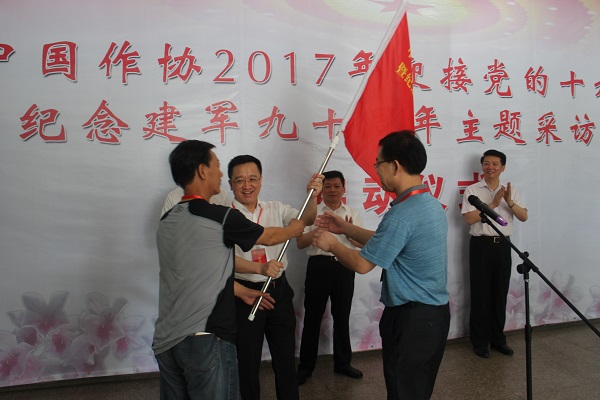 2017年是中國人民解放軍建軍九十周年。為緬懷革命先烈,以文學(xué)形式謳歌我國軍隊(duì)建設(shè)的巨大成就,7月9日,中國作協(xié)“迎接黨的十九大暨紀(jì)念建軍九十周年”主題采訪活動(dòng)在八一起義發(fā)生地江西南昌舉行啟動(dòng)儀式。中國作協(xié)副主席閻晶明出席啟動(dòng)儀式,向采訪團(tuán)作家代表授旗。江西省委宣傳部副部長(zhǎng)朱民安、江西省文聯(lián)黨組書記鄭翔、江西省文聯(lián)主席葉青,以及首批采訪團(tuán)20余位作家和江西省作家代表50余人參加。啟動(dòng)儀式由中國作協(xié)創(chuàng)聯(lián)部副主任馮秋子主持。