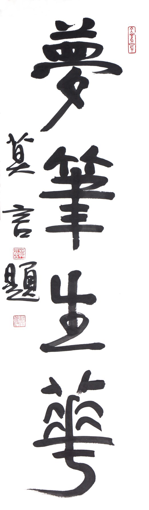 此次展覽中莫言、李敬澤、歐陽江河、張大春、馮唐、楊葵、鄭培凱、崔曼莉、徐則臣幾位作家均有書法作品展出,風格各異。張大春學書以歐陽詢開竅,其《行書自作登樓歌卷》瀟灑自得,結字疏密勻停,爭讓得體,從其作品可見涵養(yǎng)和學問的深厚。鄭培凱喜讀帖,作品《我為你寫詩》和《臨江仙》結字平正安穩(wěn),氣韻流暢,可見其對漢字結構和線條變化的深刻研究,頗有王羲之行書風范。莫言的《夢筆生花》,藏鋒運筆,結字端莊,渾樸沉著;歐陽江河《以夢為馬》的篆體纖細古拙,起筆宿墨與結尾飛白形成奇趣的藝術效果;李敬澤的隸書典雅樸厚,另有春秋。