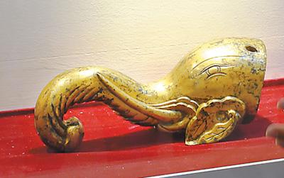 銅鎏金象首是考古隊2014年在發(fā)掘大宮門河道周邊文物時,于河底淤泥中無意發(fā)現(xiàn)的。這個泥疙瘩被送進實驗室,經(jīng)半個月清洗后,才露出了自己的“真容”。象首上有長而卷的鼻子、長牙、大耳,制作工藝考究,整體造型精巧,線條流暢自然,神態(tài)安詳逼真,雖飽經(jīng)風霜蕩滌,但在燈光下依舊金光閃耀。
