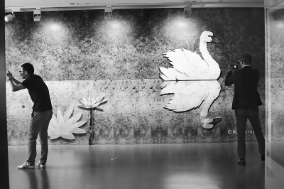 在羅伯特·英潘的表現(xiàn)下,丑小鴨從蓮花中變成一只美麗白天鵝的瞬間,隔著玻璃,依然具有震撼人心的力量。還有賣火柴的小女孩,畫面充滿溫暖和甜美,夢(mèng)幻中的小女孩惹人憐愛。安東尼·布朗著名的威利和大猩猩,是孩子們的最愛。大猩猩外表孔武有力,內(nèi)心溫暖,根根毛發(fā)畢現(xiàn)。看著“夢(mèng)想家威利”系列,小朋友在講解叔叔的引導(dǎo)下,細(xì)心地?cái)?shù)起了香蕉,原來高跟鞋是香蕉,話筒是香蕉……而那個(gè)唱歌的威利原型竟然是美國搖滾樂巨星貓王。