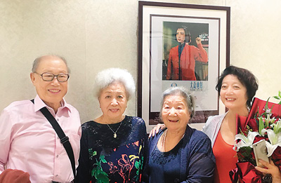 著名演員謝芳(左二)等在謝芳主演的電影《青春之歌》劇照前留影