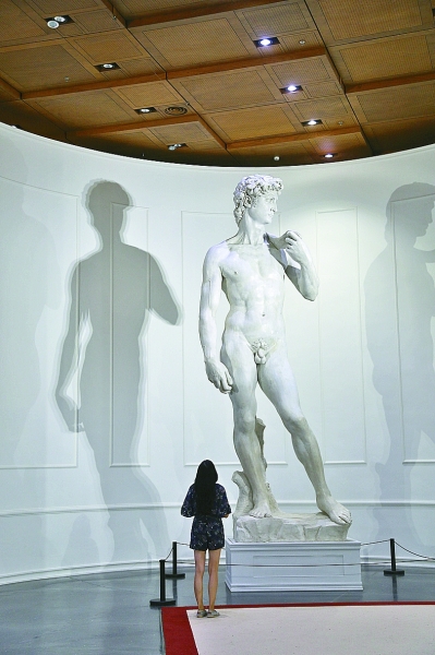 過了一會兒,他給記者發(fā)來微信:“我剛才說錯了,看到后面感覺太好了。”展廳往里走,可以看到米開朗基羅《創(chuàng)世紀(jì)》濕壁畫的臨摹作品、古紙復(fù)制素描,以及《圣殤》《酒神》等翻模雕塑,其中尤為醒目的《大衛(wèi)》雕像為世界上僅存三件之一的1∶1原模復(fù)刻。這位學(xué)了三年雕塑專業(yè)的大學(xué)生說:“近距離觀察,能看清線條的作用、素描的節(jié)奏,看清雕塑上的起伏和深度,這是靠圖片或講解體會不到的。我覺得原作也好,復(fù)制品也好,其根本價值在于內(nèi)容,不必太過糾結(jié)于形式?!?/p>