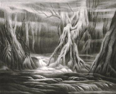 張弛的山水畫,汲取了東瀛水墨畫的養(yǎng)分,作品虛幻之境的獲得,在很大程度上來自“水暈?zāi)ぁ钡倪\(yùn)用,反復(fù)渲染,使作品形成了層次豐富又統(tǒng)一的調(diào)性,這是中國畫不太具備的一種藝術(shù)品質(zhì)。同時,她繼承了中國畫講究筆性的藝術(shù)特征,大塊面的點(diǎn)子皴和描寫根須與坡石的折帶皴,不僅與多調(diào)性的渲染融為一體,而且賦予畫面以幽深微茫的山水意境。