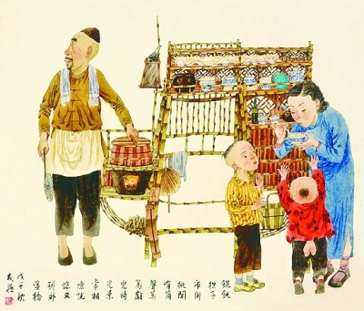 餛飩擔(dān)子市街挑(中國(guó)畫)謝友蘇