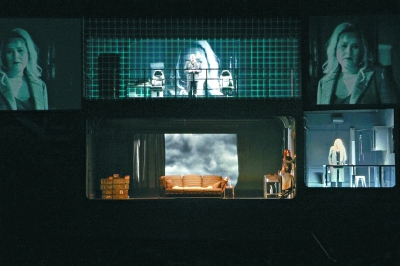 這是一版理念極其先鋒的制作,導(dǎo)演特雷林斯基對原作的重新構(gòu)建非常大膽。特雷林斯基導(dǎo)演將全劇三幕的劇情全部移植到鋼鐵戰(zhàn)艦上,這里看似僅僅是劇情發(fā)生地的簡單變動,但其實(shí)充滿了“合理性”層面的挑戰(zhàn)。特雷林斯基導(dǎo)演以大范圍的視覺調(diào)度解決了這一難題。第一幕“九宮格”式布局的戰(zhàn)艦橫截面,將船艙分割為九個獨(dú)立的空間,第二幕則實(shí)現(xiàn)了從頂層甲板的控制室到底層彈藥艙的轉(zhuǎn)換,第三幕觀眾的目光又聚焦在封閉的病房中,如果細(xì)細(xì)算來,觀眾在劇中一共看到了四層、十二個不同的視覺空間,同樣體量的布景足夠完成一部電影的拍攝。如此豐富的舞臺設(shè)計為男女主人公留下了足夠的表演區(qū)域,也解決了觀眾長達(dá)五個小時觀演中視覺上的枯燥乏味,當(dāng)然最重要的是讓劇情的每一步發(fā)展都足夠自然流暢。在第三幕中,特里斯坦以大段篇幅回憶自己的一生,特雷林斯基直接將童年記憶以實(shí)景呈現(xiàn),燒焦的木屋赫然出現(xiàn),極為寫實(shí)的木屋與鋼鐵戰(zhàn)艦的氛圍形成強(qiáng)烈對比,將原本理解難度巨大的唱詞與童年傷痕聯(lián)系在一起,即使初次接觸這部歌劇的觀眾,也不難感受到其中的凄慘。