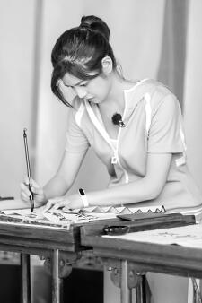 ▲嘉賓在濂溪書院誦讀《愛蓮說》。?嘉賓陳妍希在體驗女書寫作。 湖南衛(wèi)視 供圖
