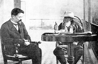 在1957年上海人民美術(shù)出版社出版的《契訶夫畫傳》中,有這樣一幅照片:一個(gè)簡樸的陽臺,桌上放著小小杯盞,托爾斯泰似乎在向契訶夫“訓(xùn)示”著什么,后者謙卑地將雙手交叉在一起,高大的身體佝僂著,低著腦袋,朝他的方向傾聽著,像是一個(gè)溫順的農(nóng)婦。這是契訶夫?yàn)閿?shù)不多的對托爾斯泰的拜訪景象之一。它讓人想起契訶夫成名后的那句話:如果托爾斯泰還活在這個(gè)世界上,我就覺得有依靠,即使自己寫不出什么,也讓我感到安穩(wěn)。如今,眼前坐著的,就是一個(gè)可以籠罩他文學(xué)事業(yè)的藝術(shù)上的巨人。很顯然,他的溫順,讓這樣一個(gè)同樣欣賞他才華的強(qiáng)者感到高興: