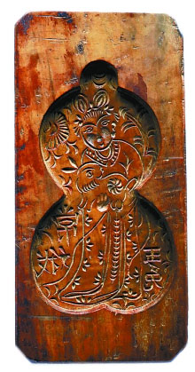 這款民國制作的較為特殊的異形月餅模具“福祿同喜”,是于進江在多年前從一位藏家手中“換得”的。而交換的籌碼是當年還被視為“稀有品”的手機。葫蘆紋樣在古代備受推崇,但是作為異形葫蘆的月餅模具卻極為難得。而在紋樣的選取上,一般是“喜”字、“壽”字和“玉兔”,單獨的嫦娥玉兔卻很少見。不同于傳統(tǒng)的技藝,這塊模具將仕女圖的繪制技法融合其中??梢?,在小小的一塊模具上也大有乾坤,無論是民間藝術品還是大師佳品,都是多元藝術元素融合的結(jié)晶。