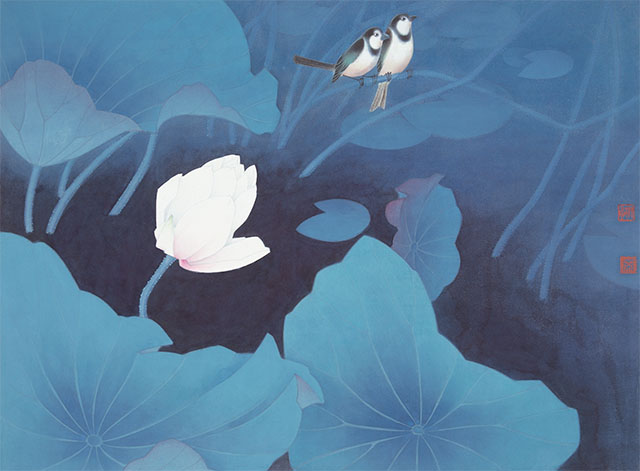 康淑貞作品的藝術(shù)特色與成功,在《晨霧濃》《荷塘》《幽谷月光》《花色重》《黃玫瑰》等畫作中,得到鮮明表現(xiàn)。《晨霧濃》表現(xiàn)早晨濃霧彌漫中的景色,畫家用大寫意的手法暢快淋漓地鋪染了藍(lán)灰色的濃霧,在此背景上,以被北京人稱為“雪青”的常色,用傳統(tǒng)的“隨類賦彩”的方法勾畫暈染出兩支極富動(dòng)感的夾竹桃,在夾竹桃的花枝間兩只黑頭、白脯、紅背小鳥側(cè)目眺望,好像要探覓出霧中之謎。整個(gè)畫面虛實(shí)相間,互相映照,統(tǒng)一而豐富?!逗商痢凡灰酝ねび窳⒃诤扇~之上的花為主題,而是把幽深荷葉中朦朧月色籠罩下含苞待放的花苞作為表現(xiàn)對(duì)象。在墨藍(lán)的水塘中,在碧葉的掩映下,一朵白里泛紅的荷苞挺拔而出,嬌嫩妍麗,生動(dòng)地表現(xiàn)了被歷代文人墨客所贊頌的荷花出污泥而不染的精神。荷梗上一雙白脯綠背小鳥,正引頸向荷葉外張望,微妙地把人們的意念引向了荷塘外廣闊的天地。這幅畫在著色與勾線上也極見功力,荷苞設(shè)色艷麗,水分飽滿,給人一股充沛的生氣。大面積的荷葉暈染清柔透明,濕潤(rùn)跳脫,極富質(zhì)感又無(wú)匠氣。荷葉上用紅毫勾勒出的網(wǎng)絡(luò)脈紋,工細(xì)有力,而斜向橫出的荷桿則挺拔勁健,兩者互相照應(yīng),更增加了整個(gè)畫面的力度。整幅畫構(gòu)圖新巧,意境幽深,給人耳目一新之感?!队墓仍鹿狻繁憩F(xiàn)幽谷月光下的夜色。大膽用深藍(lán)暈染背景,既顯示了谷之幽,又顯示了夜之深。在這種深幽的背景上,清艷的芍藥花及花下靜臥的小鳥,顯示著月色的光感。畫中的斑斕山石,是用積水法多次暈染而成,它處于幽深背景與光感花朵之間,成為中間色調(diào),使畫面豐富而協(xié)調(diào)。蘇軾說(shuō):“論畫以形似,見與兒童鄰。作詩(shī)必此詩(shī),定知非詩(shī)人。”《幽谷月光》正是在意象的描繪中,表現(xiàn)出一種畫中有詩(shī)的意境。