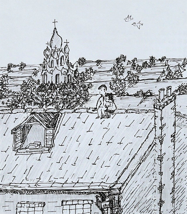 女孩和同事來(lái)到了這條熟悉的小街。此刻,小金(鳴蟲(chóng),俗名“金鈴子”)敏銳聽(tīng)到,零星的弟兄們?nèi)栽诓恢>氲爻琛?(出自《方島·童話》)