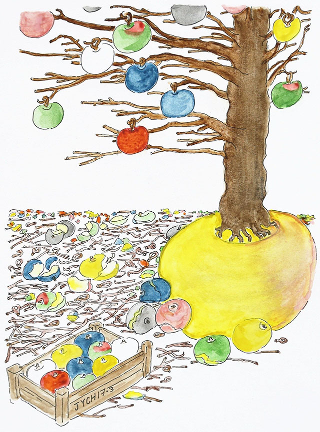 四周悄然無(wú)聲,蘋果樹(shù)亭亭玉立,儼然一桿寶幡,綠森森地蔭著人們。 (出自《方島·譬喻》)