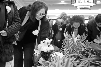 昨天,八寶山殯儀館告別廳內(nèi),一名女士為高莽先生獻(xiàn)上花束。 實(shí)習(xí)記者 武亦彬攝