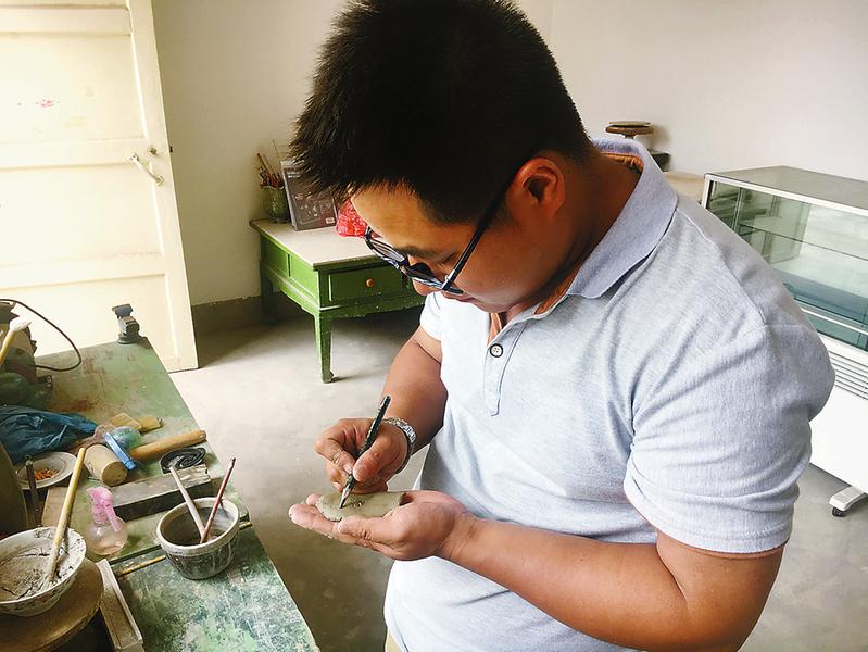 李和平展示自家瓷坊里燒制的青釉刻花執(zhí)壺