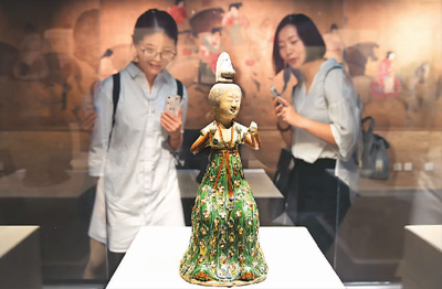 杭州舉行“一日看盡長(zhǎng)安花——唐都長(zhǎng)安三彩精華展”。圖為觀眾在欣賞“三彩釉陶梳妝女坐俑”。 李 忠攝(新華社發(fā))
