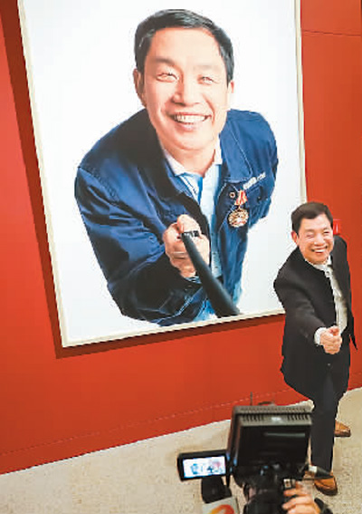 中國(guó)國(guó)家博物館舉行“擼起袖子加油干——‘中國(guó)夢(mèng),勞動(dòng)美’”影像展。圖為謝子龍?jiān)谧约盒は褡髌非啊?新華社記者 沈伯韓攝
