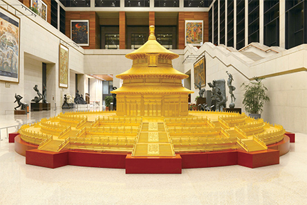 此次入藏國(guó)博的這件天壇祈年殿模型,是陳麗華于20世紀(jì)90年代聘請(qǐng)趙崇茂、樸學(xué)林、王仲杰等故宮老專(zhuān)家多次到現(xiàn)場(chǎng)勘察設(shè)計(jì),選用珍貴的緬甸柚木,由幾十名高級(jí)技術(shù)工人耗時(shí)三年多純手工制作的,并在表面手工貼了三層24K99金箔,模型通體金碧輝煌、美輪美奐。模型完全以原建筑物為準(zhǔn),采用中國(guó)傳統(tǒng)的榫卯結(jié)構(gòu)以1:10的比例精心雕制而成,直徑9米,高3.8米,各部件嚴(yán)絲合縫卻又能拆裝自如,工藝考究、一絲不茍,具有很高的藝術(shù)價(jià)值和收藏價(jià)值。模型再現(xiàn)了祈年殿的古風(fēng)原貌,可使觀眾近距離欣賞到中國(guó)古建筑藝術(shù)和木雕藝術(shù)之美,也展現(xiàn)了中國(guó)紫檀博物館在木雕藝術(shù)上的造詣傳承。