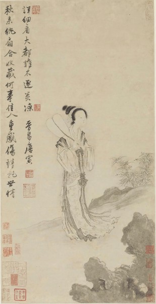 上海博物館書畫研究部主任凌利中告訴記者,新陳列中首次露面以及許久未展的展品有25件,其中最受業(yè)界關(guān)注的莫過于唐伯虎的 《秋風(fēng)紈扇圖軸》?!斑@是中國古代書畫史上繞不過去的一件作品,說到唐伯虎的水墨人物畫,人們第一個(gè)想到的就是它?!绷枥姓f,在“明四家”中,唐伯虎是個(gè)性最鮮明的一個(gè),雖有“江南第一風(fēng)流才子”名號(hào),但一生坎坷不得志?!肚镲L(fēng)紈扇圖軸》 描繪了一名手持紈扇佇立在秋風(fēng)中的美人,她側(cè)身凝望,眉宇間微露悵惘神色。畫軸左上角有畫家自題詩:“秋來紈扇合收藏,何事佳人重感傷,請(qǐng)把世情詳細(xì)看,大都誰不逐炎涼?!蓖干涑鎏埔淖試@之情。