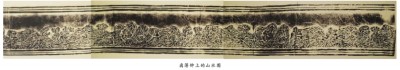 山谷,溪水沿谷底而流。左上方,有一亭式建筑倚立于左三山的山坳之前。右山腳下的溪水邊,停泊著一小木舟,景象異常恬靜。第三個(gè)空間,則是第二個(gè)空間左三山向左的延續(xù),在畫(huà)面最左面的山坳間,亦有兩座茅屋隱現(xiàn)。有的茅屋頂上挑著一面小旗,是為酒肆的標(biāo)志。從整個(gè)畫(huà)面看,近景是峰巒迭嶂,遠(yuǎn)景則是山勢(shì)連綿。樹(shù)木、溪流、小橋、木舟、茅屋、酒肆等點(diǎn)綴其間?!薄熬望u簿鐘飾紋帶所表現(xiàn)的山水題材來(lái)說(shuō),也具有北宋繪畫(huà)中山水長(zhǎng)卷的時(shí)代特征?!?/p>