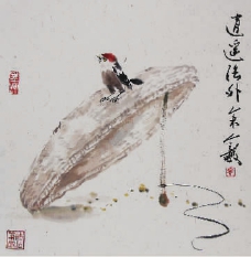 有時(shí)候,大自然會(huì)無(wú)私地恩賜給你美好的創(chuàng)意。記得是一個(gè)秋天的下午,我去花溪的陽(yáng)光水鄉(xiāng)畫(huà)殘荷,偶然發(fā)現(xiàn)一只青蛙爬到了干枯了的蓮蓬頂上,昂首張望,一副“孤芳自賞”的姿態(tài),我趕緊拍了一張照片,便又促成一趣。